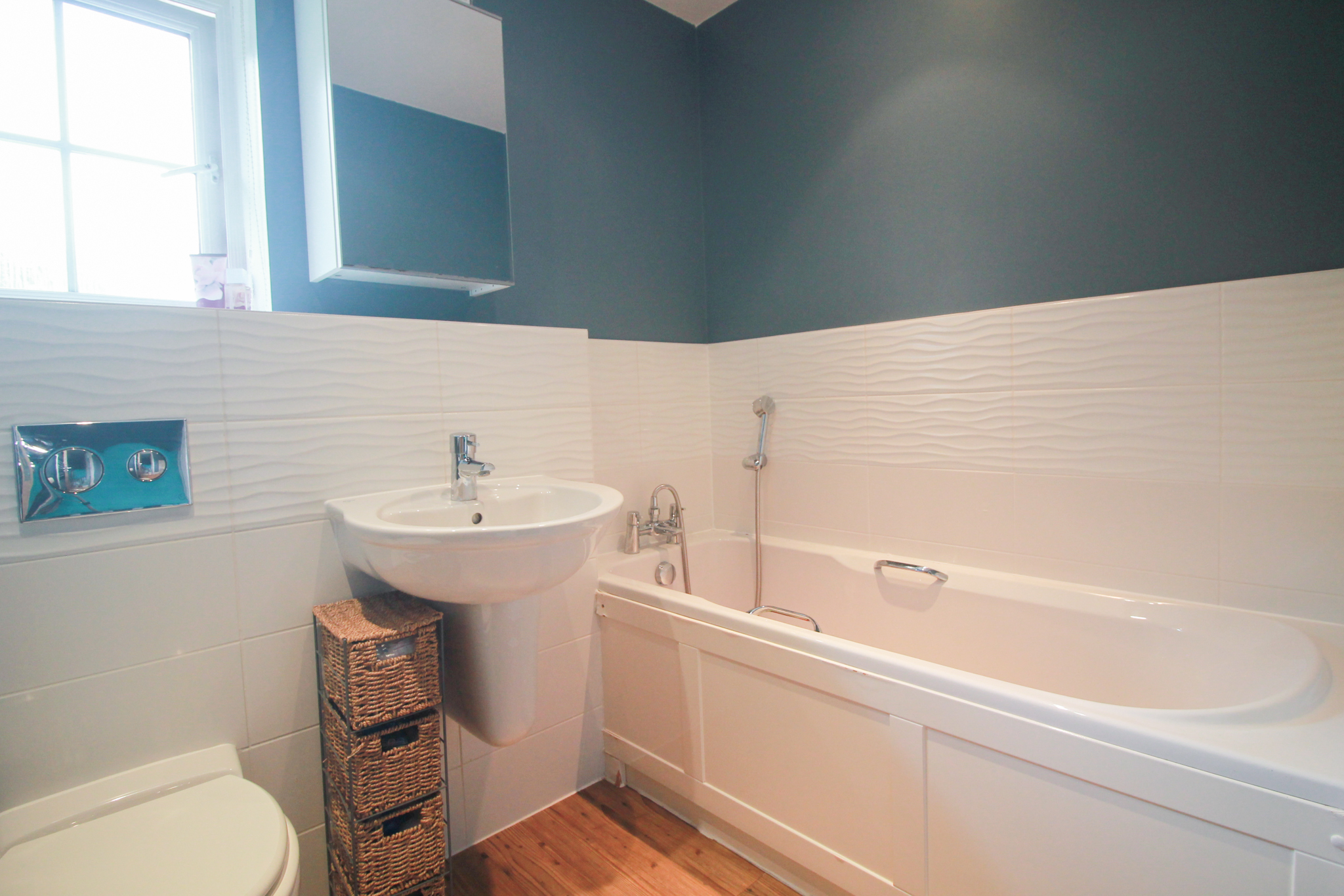 Bathroom - Fitted suite comprising of panel bath with mixer tap and shower attachment, low level w/c with concealed cistern, wash hand basin with mixer tap, heated ladder towel rail, wooden style flooring, obscured double glazed window to front, wall mounted medicine cabinet.