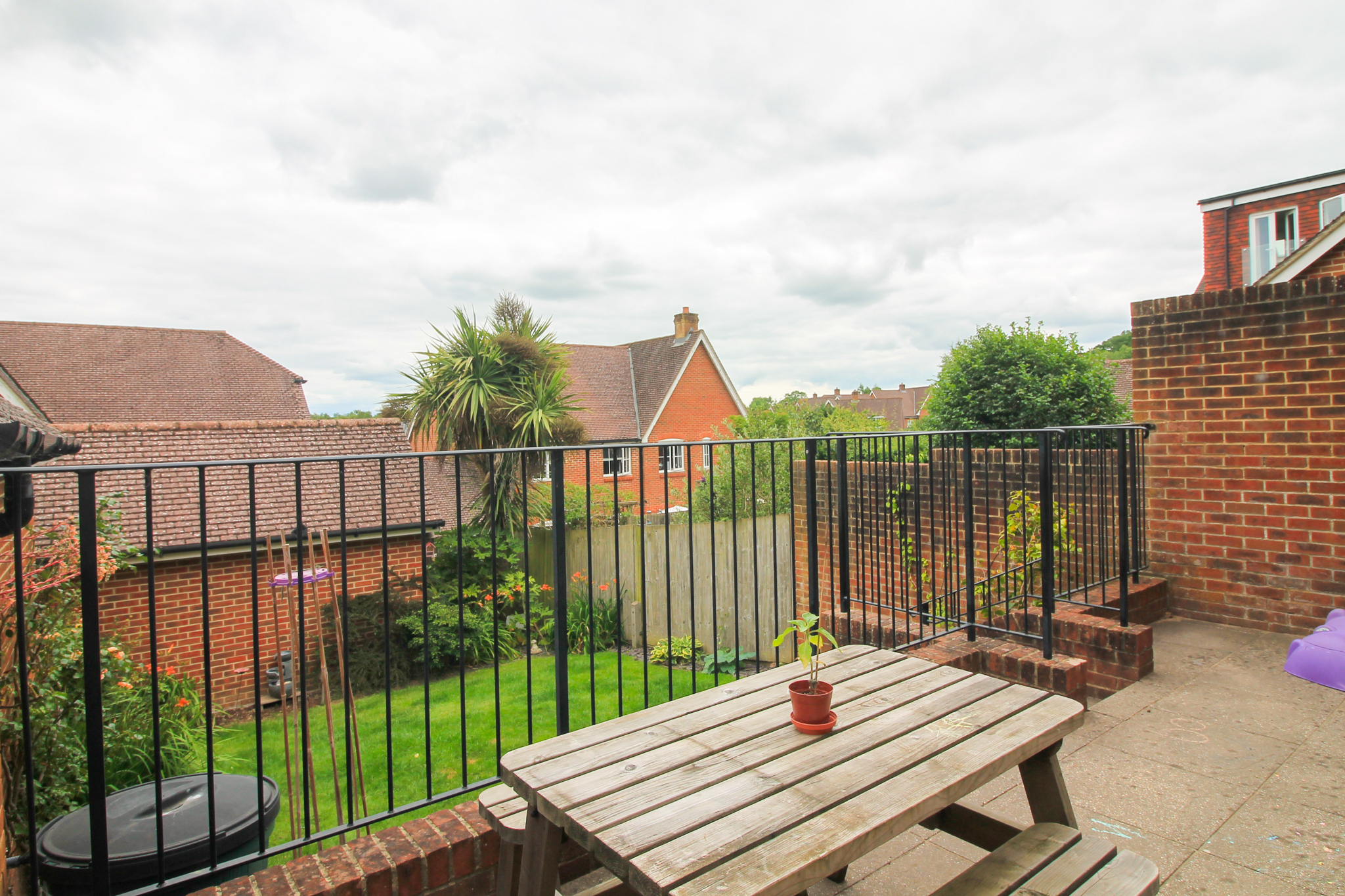 Rear Garden - A generously sized patio offers a sunny seating area, perfect for outdoor relaxation and entertaining. Steps lead down to a well-maintained lawn bordered by mature shrubs, all enclosed by a combination of brick walls and panel fencing for privacy.