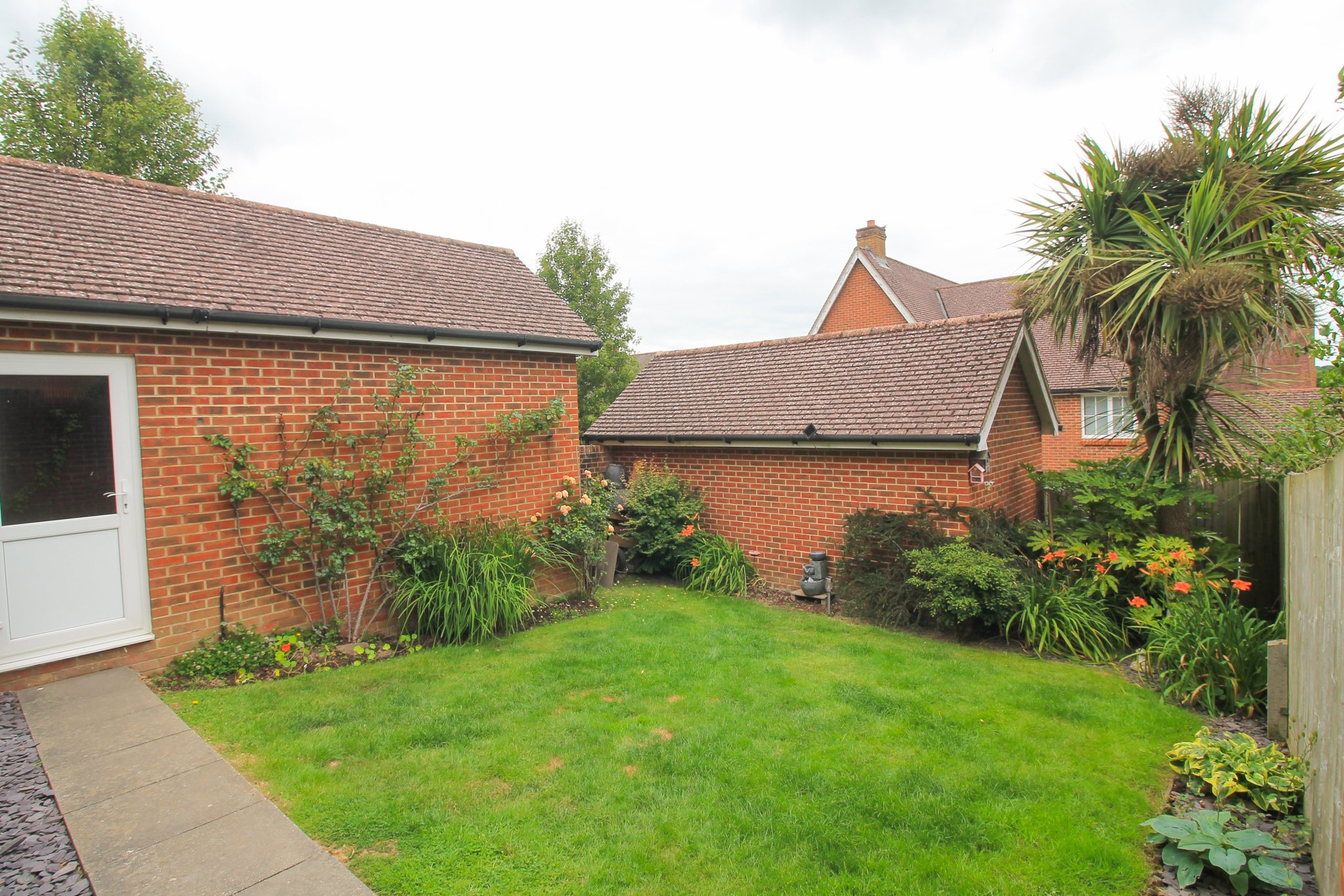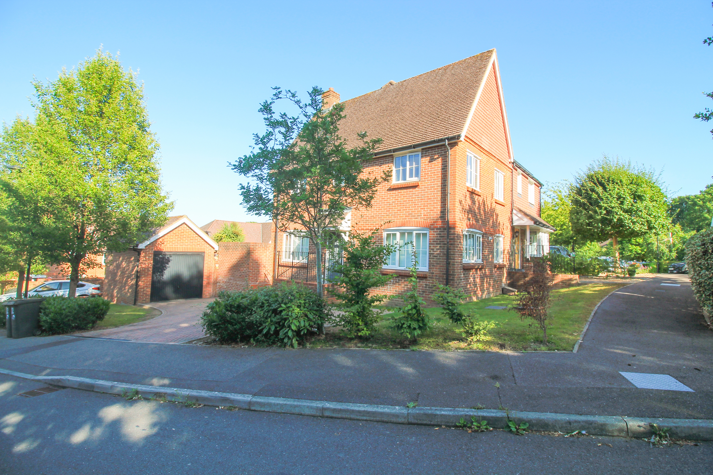 Front Garden - The property boasts a spacious block-paved driveway providing off-road parking for two vehicles, leading to a detached garage with an up-and-over door, power, and lighting. A neatly maintained lawn wraps around the front and side of the property, complemented by established shrub borders.