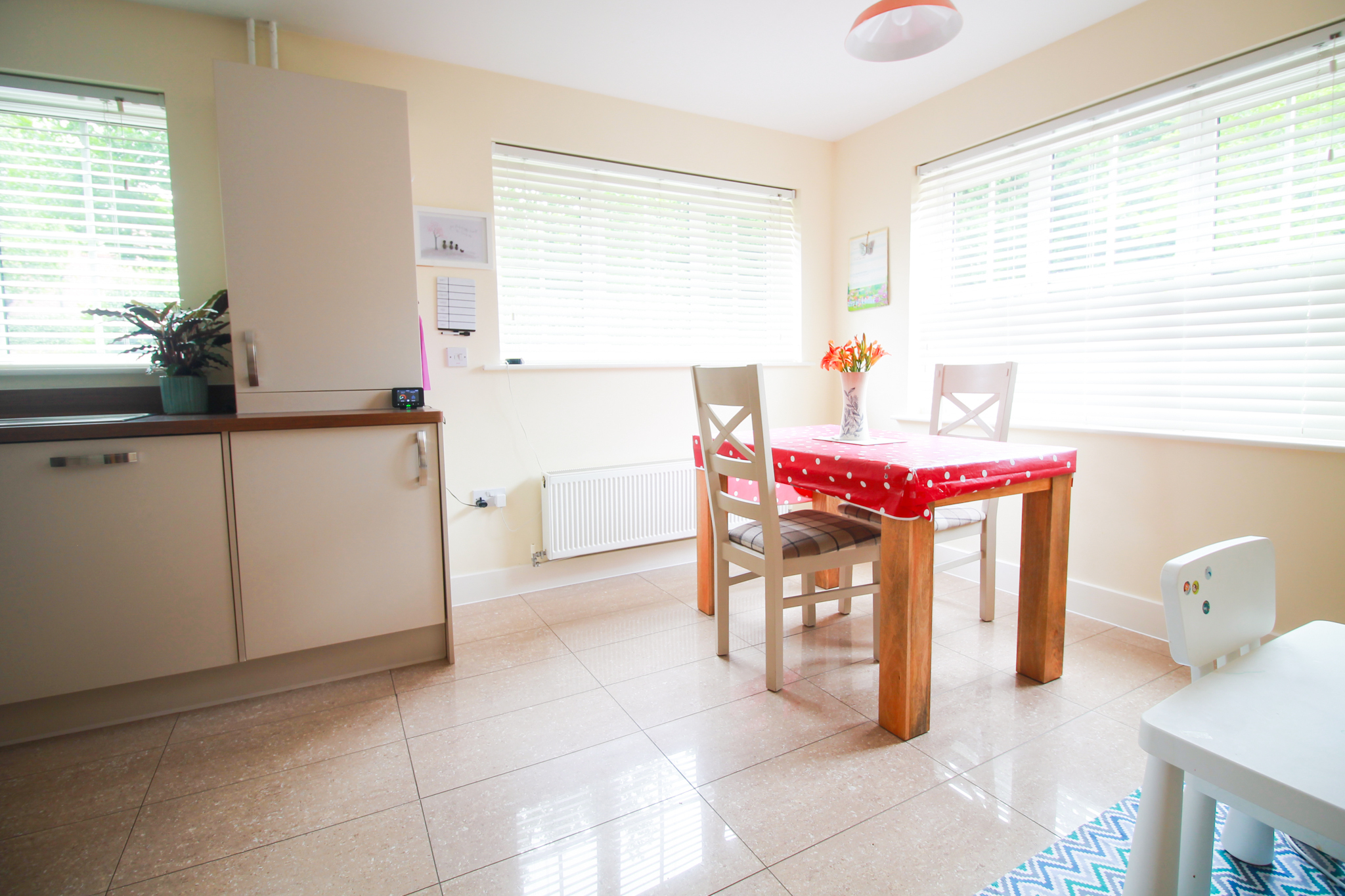 Kitchen/ Breakfast Room- range of wall and base units with contrasting work surface, four ring gas hob with electric oven underneath, inset 1.5 bowl sink and drainer with mixer tap, double glazed windows to the front and side, in built fridge freezer, integrated dishwasher and washing machine, cupboard housing the gas boiler, radiator, tiled flooring.